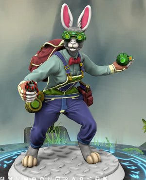 Jenny is a tall, gangly grey and white rabbit humanoid. She is always sporting her signature goggles, which she uses for close examinations and assembly of her various devices. She is always sporting overalls, coveralls, or some sort of mechanist/alchemist's gear, with fancy business clothes beneath. Always to her side is her pack and utility belt, filled with various alchemical materials or spare grenades.