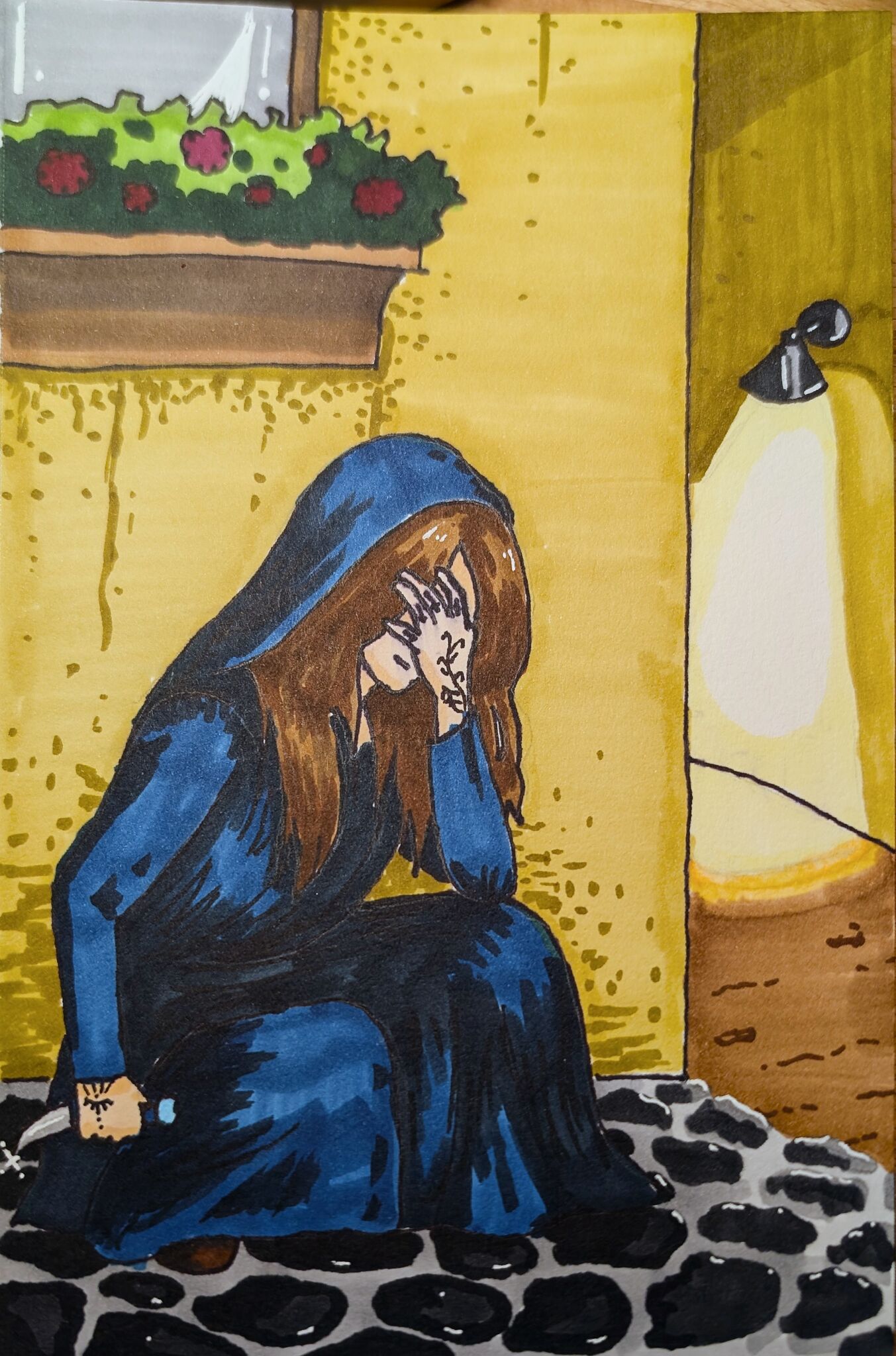Drawing of Tessa Night kneeling in the shadows near a town alleyway. She is covering her face with her hand, showing off her knife tattoos on her fingers.